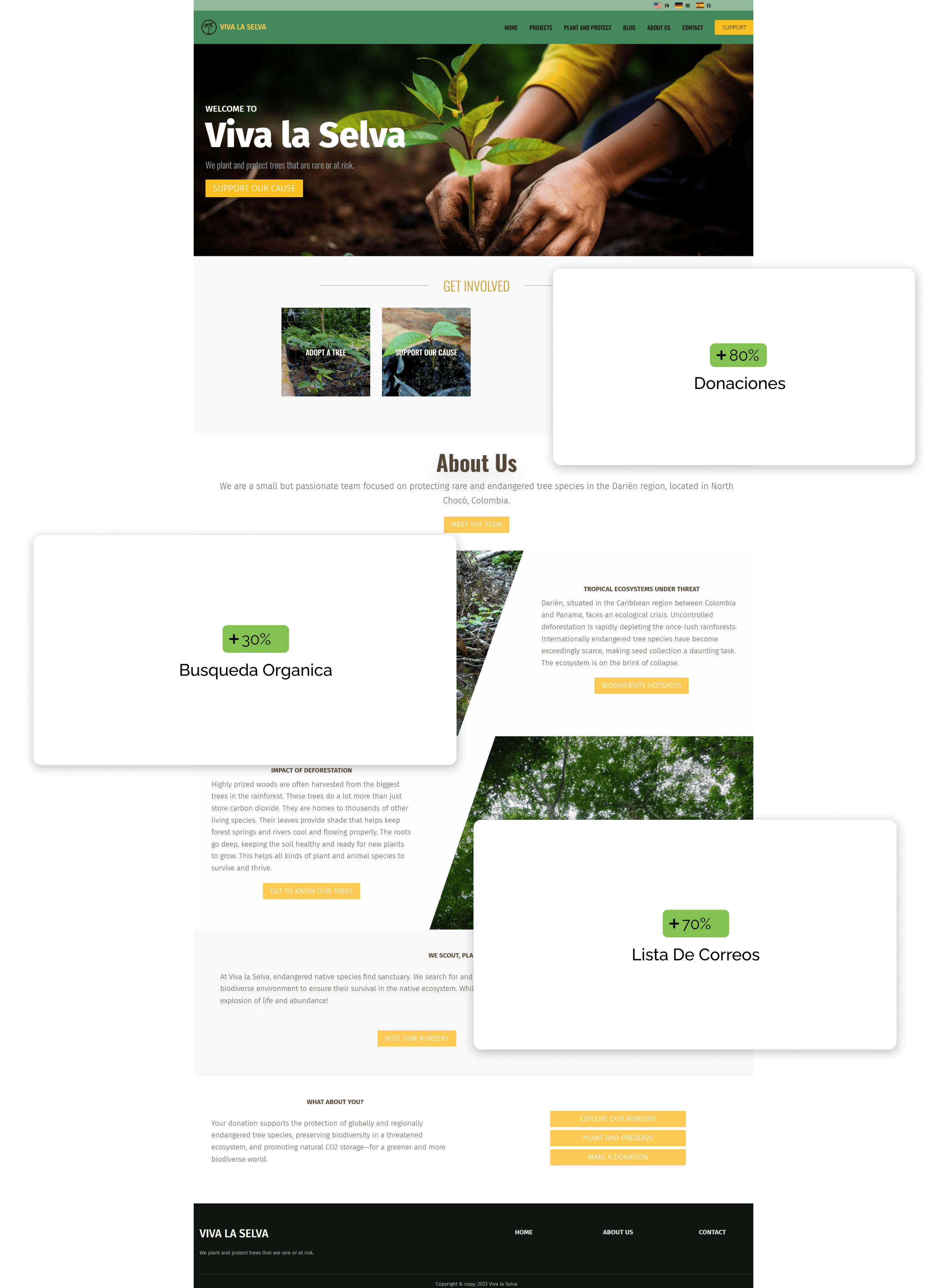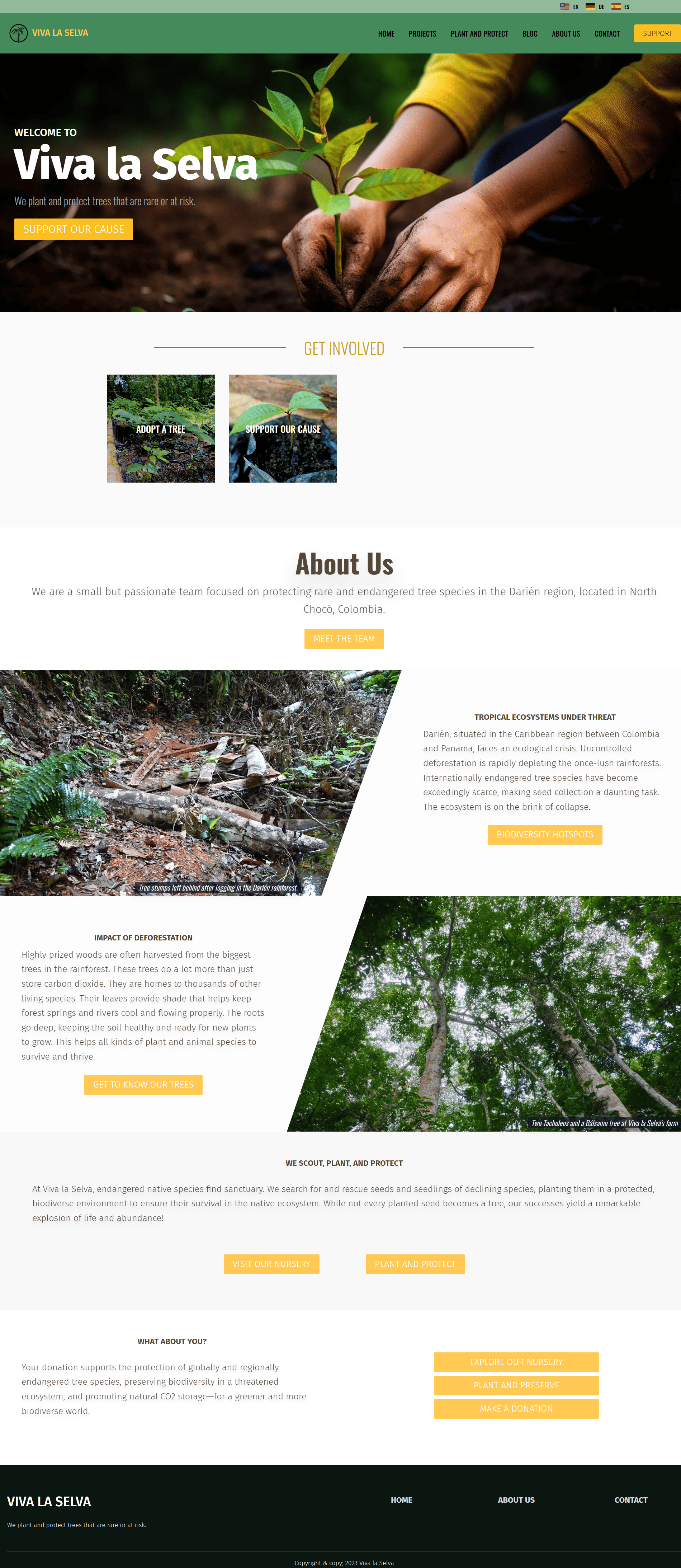 vivalaselva.org Es una organización enfocada en proteger especies de árboles raras y en peligro de extinción en la región del Darién, en el norte del Chocó, Colombia. Se dedican a plantar y preservar árboles amenazados por la deforestación descontrolada y la degradación ecológica, promoviendo la biodiversidad y el almacenamiento natural de CO2. Invitan a la participación pública a través de la adopción de árboles y donaciones.
